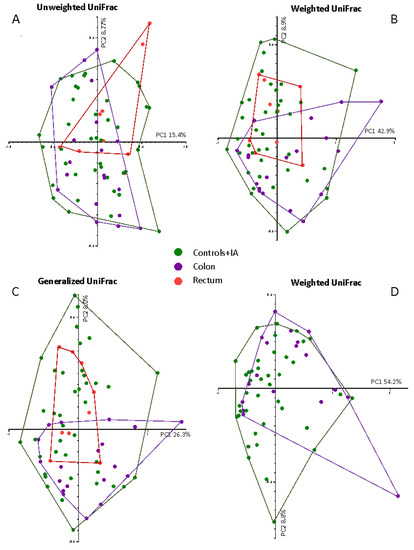 β-diversity of controls and intestinal adenoma (Controls + IA) group, colon cancer (Colon) and rectal cancer (Rectum) among subjects into the fifth quintile of 16S rRNA gene copies. The figure shows the UniFrac ®-diversity in all the three variants: (A) Unweighted UniFrac; (B) Weighted UniFrac; (C) generalized UniFrac for all the three groups: Controls + IA, Colon and Rectum. Panel (D) shows the Weighted Unifrac for Controls + IA and colon cancers after post-hoc analyses.