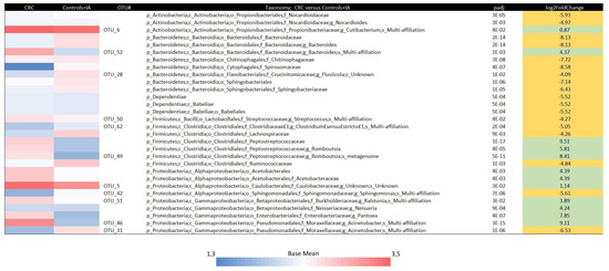 Different taxa between colorectal cancer (CRC) cases and controls and intestinal adenomas (IA) group by DESeq2 analyses. The taxonomic lineage of each taxon is shown: p, phylum; c, class; o, order; f, family; g, genus; OTU#, Operational Taxonomic Unit. The first two columns show the logarithmic transformation of normalized base mean value for each group. The “padj” column shows the p-value for heterogeneity between groups adjusted for multi-testing analyses. Positive fold changes (shown on a green background) designate taxon overrepresentation in the CRC group. Negative fold changes (shown on a yellow background) designate taxon underrepresentation in the CRC group.