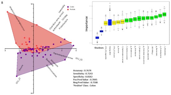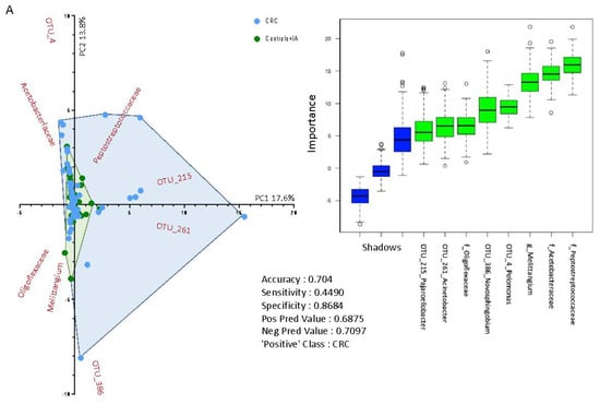 Biplot of predictive variables discriminating (A) colorectal cancer (CRC) versus control and intestinal adenoma (IA) subjects; (B) colon versus rectal cancer cases, using Random Forest algorithm. The boxplot on the right side of each figure shows the importance (based on mean accuracy level) of the variables by Boruta feature selection. The shadows are part of the Boruta algorithm and show the max, medium and lowest level of mean accuracy, using the same dataset with group labels shuffled. The table in the middle part of each figure shows the Random Forest results considering the ‘Positive’ Class as indicated.
