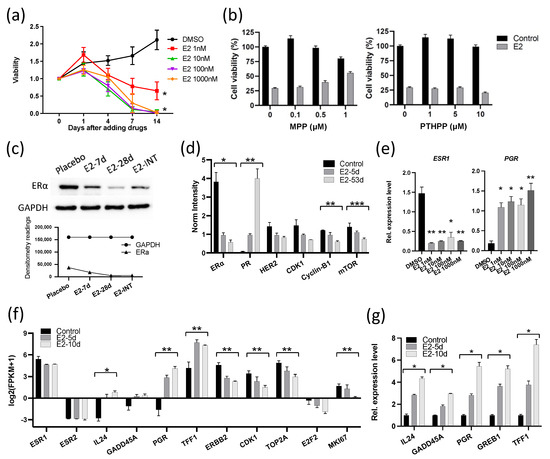 E2 suppressed the expression of ERα and cell cycle proliferation genes in GS3: (a) Cell viability of 104 organoids (isolated from GS3 tumor) treated with varying concentrations of E2 in vitro (* p < 0.0001). (b) Cell viability of organoids (isolated from GS3 tumor) co-treated with E2 and an ERα antagonist (MPP) or ERβ antagonist (PTHPP) in vitro. (c) ERα expression of GS3 tumors treated with placebo, 7-day E2, 28-day E2, and intermittent E2 by Western blotting; whole blots can be found in Figure S4. (d) Protein expression levels of GS3 tumors treated with 5- and 53-day E2, and control samples, as determined by reverse-phase protein array analysis (* p = 0.013, ** p < 0.01, *** p = 0.04). (e) ESR1 and PGR expression levels of GS3 organoids treated with varying concentrations of E2 in vitro (* p < 0.05, ** p < 0.01). (f) Log2 (fpkm + 1) of gene expression in GS3 tumors treated with 5- and 10-day E2, and control samples, as determined by bulk RNA-Seq (* p = 0.007, ** p < 0.05). (g) Gene expression levels of GS3 organoids isolated from GS3 tumors with 5- and 10-day E2, and control samples (* p < 0.0001). Error bars represent the SEM, and p-values were determined by two-way ANOVA analysis (a) and multiple unpaired t-tests (d–g). E2-INT: intermittent E2 treatment.