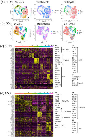 SC31 and GS3 tumors were analyzed by scRNA-Seq: (a) UMAP of cells from both placebo- and E2-treated SC31-PDX, color-coded according to clusters, treatments, and cell cycle phases. (b) UMAP of cells from both placebo- and E2-treated GS3-PDX, color-coded according to clusters, treatments, and cell cycle phases. (c) Heat map using the top 10 differentially expressed genes in SC31. (d) Heat map using the top 10 differentially expressed genes in GS3.