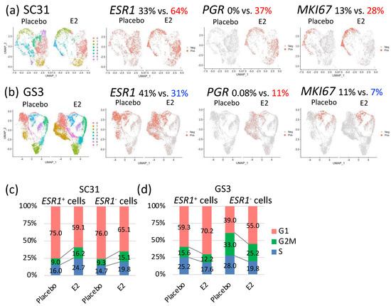 Gene expression comparison of cells from tumors treated with E2 vs. placebo: selected feature plots of cells expressing ESR1, PGR, and MKI67 in UMAP, separated by treatments in (a) SC31 and (b) GS3; distribution of cells in the G1, S, or G2/M phases in ESR1+ and ESR1– cells, separated by treatments in (c) SC31 and (d) GS3.