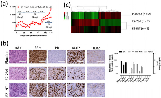 Intermittent E2 treatment in GS3: (a) Tumor growth curves of intermittent E2 (1 mg) treatment that was cycled every 28 days (E2 pellets on/off every 4 weeks, three times), after tumor volume reached approximately 200 mm3. (b) Hematoxylin and eosin staining and immunohistochemistry of GS3 tumors treated with placebo, E2 (4 weeks), or intermittent E2; scale bar represents 100 μm. (c) Hierarchical clustering using 1312 differentially expressed genes from bulk RNA-Seq.