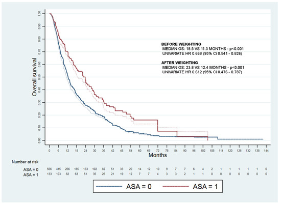Kaplan–Meyer curves of overall survival before (dashed lines) and after weighting (full lines) of aspirin treated (ASA = 1) and not treated (ASA = 0) patients.