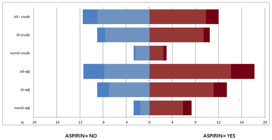 Overall bleeding events were more frequent in aspirin-treated than in non-aspirin-treated patients (18.1 vs. 11.3%, p < 0.001). This finding was due to an increase in both gastrointestinal (14.4 vs. 9.0%, p = 0.002) and non-gastrointestinal (6.4 vs. 2.6%, p = 0.001) events. However, the rate of grade > 3 bleeding events was similar across the study groups (4.6 vs. 3.9%, p = 0.401) (Figure 3).