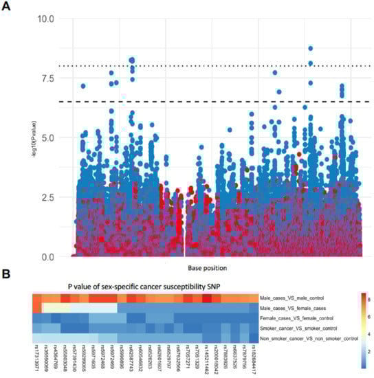 Identification of lung cancer risk sex-specific SNPs. (A) Manhattan plots of tested X chromosome SNPs. The distribution of the P-values of the X chromosome SNPs was plotted for the male (blue) and female (red) analyses. SNPs in the pseudo-autosomal regions, both PAR1 and PAR2, were not considered. The dashed line indicates the threshold for significant association as calculated by −log [0.05/171,804] where 171,804 was the number of X chromosome SNPs tested. The dotted line indicates the accepted threshold for analyses involving SNPs over the whole genome. (B) Heatmap showing p values of identified SNPs in subgroup association analysis. The cells in red indicate the SNPs whose p-values were significant.