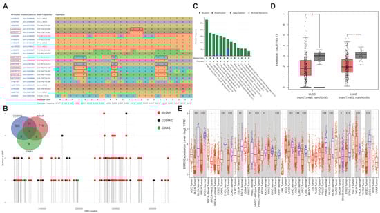 Genetic alteration and gene expression of DMD. (A) Haplotype analysis of identified SNPs in DMD. (B) Genomic position of identified SNPs, pathogenic SNPs in cancer and Duchenne muscular dystrophy in DMD. (C) The alteration profile of DMD in 3163 lung cancer samples reported in cBioportal. (D) Expression of DMD in TCGA-LUAD and TCGA-LUSC cohort. (E) Pan-cancer analysis of differential DMD expression. The significant p value was indicated as 0 ≤ *** < 0.001 ≤ ** < 0.01 ≤ * < 0.05.