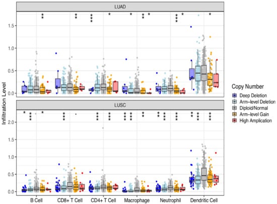 Copy number variation (CNV) has been observed in many studies to participate in the occurrence and development of cancer, and the number and complexity of CNVs are associated with the prognosis of many cancer types. Somatic copy-number alterations (SCNAs) affect a larger fraction of the genome, which can potentially activate an oncogene or inactivate a tumor suppressor gene. SCNAs can be further divided into focal SCNAs (shorter than one chromosome arm) and arm-level SCNAs (chromosome-arm length or longer) [,]. The SCNA subtypes, including deep deletion, arm-level deletion, diploid/normal, arm-level gain, and high amplification, can be defined by GISTIC 2.0 []. Studies of the correlation of gene mutation with immune infiltration levels in cancer facilitated the understanding of the interaction between malignant cells and the host immune system []. Therefore, we investigated the correlation of SCNA and tumor infiltration levels in LUAD and LUSC. As indicated in Figure 4, more tumor infiltrating cells were associated with DMD somatic copy-number alterations in LUSC than in LUAD. Of note, significant arm-level DMD deletion occurred in LUSC samples with CD4+ T cells infiltration (Figure 4), supporting the hypothesis that decreased expression of DMD caused by mutation may affect CD4+ T cell infiltration in LUSC.
