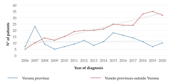 The number of new diagnoses of all types of CMD from January 2006 to January 2021 in the people resident in the province of Verona and in the other provinces of the Veneto region (excluding Verona) is represented in Figure 1. In the Verona province, the number of new CMD diagnoses/year appears stable since 2012 with a mean number of 11.8 cases per year (±3.6 SD), while in the other provinces, the number of new cases/year referred to GISM progressively increased from 5 to 32 new diagnosis/year (2006–2021). The incidence of new cases/100,000 inhabitants/year in the adult population residing in the province of Verona in 2018, 2019 and 2020 was 1.26, 0.75, and 1.25, respectively (mean 1.09).