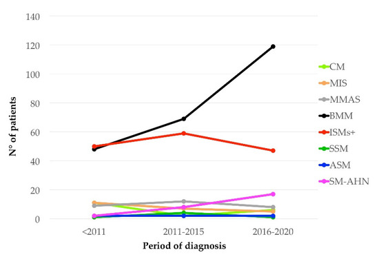 In Table 1, we compared the frequency of the SM variants diagnosed at GISM with the main series published in the literature. Within our series, the comparison of the frequency of variants between the patients from the province of Verona alone and the entire Veneto region did not show any significant difference. In the Veneto cohort, ISM represented the great majority (91%) of the SM, and BMM cases accounted for 54.8% of all the SM variants. Among the advanced forms, the most frequent was SM-AHN (6.3%). As shown in Figure 2, there was a steep increase in the number of BMM diagnoses comparing the first years of GISM activity (before 2011) and the more recent years. Similarly, only 2 diagnoses of SM-AHN were made before 2011, while 8 and 17 cases were recognized in the years 2011–2015 and 2016–2020, respectively.