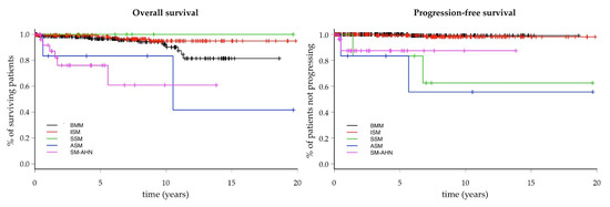 The PFS of the individual SM variants is represented in Figure 3. The estimated 10-year PFS was 100% in BMM, 98.1% in ISMs+, 62.5% in SSM, 55.6% in ASM, and 87.4% in SM-AHN.