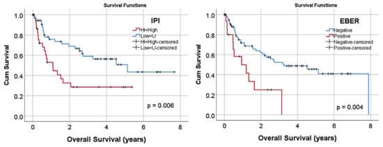 Overall survival according to the international prognostic index (IPI) and Epstein–Barr virus infection (EBER). Cases with IPI high–intermediate/high and EBER positivity were associated with poor overall survival (p < 0.01).