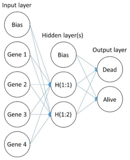 The dependent variables can be nominal, ordinal, or scale (continuous). The predictors can be specified as factors (categorical) or covariates (scale). In this study, the dependent variables were the overall survival outcome (dead vs. alive) and the Lymph2Cx molecular subtype (GCB, ABC, and Unspecified). The dependent variables were nominal, because their values represented categories with no intrinsic ranking. The predictors, which were the gene expression values of the pancancer immune profiling panel, were specified as covariates. The rescaling of covariates, which improves network training, was standardized. The database was partitioned by randomly assigning the cases based on relative numbers of cases: 70% to the training set and 30% to the testing set. In this analysis, the holdout partition was set at 0%. During the procedure, categorical predictors and dependent variables were temporarily recoded using one-of-c coding. When a variable has c categories, it is stored as c vectors: the first category (1,0,…,0), the next (0,1,0,…,0), and the final (0,0,…,0,1).