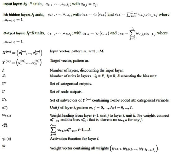 Architecture of the multilayer perceptron (MLP). The MLP is an artificial neural network that is characterized by a feedforward structure and supervised learning. The MLP network is a function of one or more predictors (known as inputs or independent variables) that minimizes the prediction error on one or more target variables (outputs). This figure shows the general architecture for the MLP network and the corresponding notation.