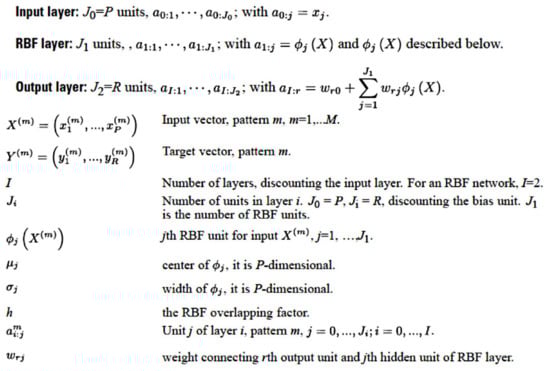 Architecture of the radial basis function (RBF). The RBF is a supervised feedforward learning network that is characterized by only one hidden layer. This figure shows the architecture of the three layers of the RBF network and the corresponding notation.