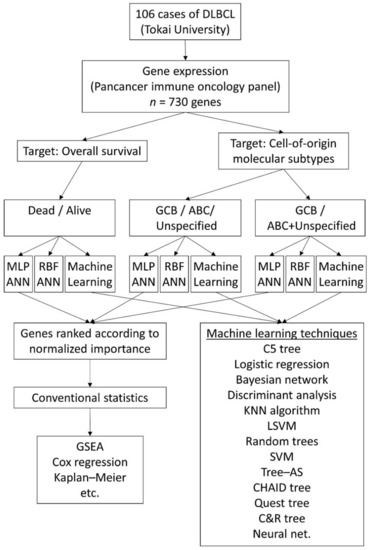 Data analysis workflow. This research used the gene expression data of 106 cases of DLBCL from Tokai University. The gene set was composed of 730 genes from the pancancer immune profiling panel. Two types of artificial neural network were used: multilayer perceptron (MLP) and radial basis function (RBF). Besides these, other machine learning techniques were included in the analysis in addition to conventional statistics.