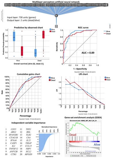 Multilayer perceptron artificial neural network for predicting overall survival. The neural network predicted the overall survival outcome as dead/alive using the 730 genes of the pancancer immune oncology profiling panel. The network performance can be checked using several parameters such as the area under the curve (AUC), which had a value of 0.89. The network performance outputs are the predictive by observed chart, the cumulative gains chart, and the lift chard. The genes were ranked according to their normalized importance for prediction of the overall survival outcome, as shown in the independent variable importance chart. The top 20 genes are listed. GSEA showed enrichment toward the dead phenotype for some genes.