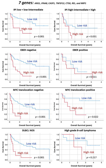 Finally, when the set of seven genes was included in the equation with the IPI, EBV, molecular subtypes, and High-grade B-cell lymphoma, only the set of seven genes (p < 0.001, HR = 5.4) and EBER (p = 0.006, HR = 5.3) retained prognostic relevance. Therefore, the final set of seven genes was an independent prognostic factor.