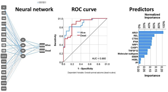 Notably, a multilayer perceptron analysis could be used to perform the multivariate analysis in a nonlinear manner (Figure 10). The input variables (predictors, 15 units) were the IPI, EBER, molecular subtypes, High-grade B-cell lymphoma, and the seven genes of the set. The output variable was the overall survival outcome (dead vs. alive, two units). The hidden layer had one layer with three units. The activation function was the hyperbolic tangent in the hidden layer and softmax in the output layer. The network performance was good, with an ROC area under the curve of 0.880 and 84.4% correct classification. The most important factors, according to their normalized importance (NI), for predicting the overall survival outcome (dead/alive) were as follows: ARG1 (100% NI), REL (63.5%), CTSG (54.2%), IFNA8 (52.7%), NRP1 (52.0%), CASP1 (47.3%), TNFSF12 (36.0%), molecular subtypes (34.9%), EBER (22.8%), high-grade B-cell lymphoma (8.7%), and IPI (6.7%).