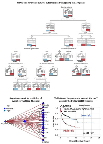 Other machine learning techniques for predicting overall survival. In addition to the artificial neural networks, other machine learning techniques were used. This figure shows the results of the CHAID decision tree and the Bayesian network. CHAID, or chi-squared automatic interaction detection, is a classification method for building decision trees by using chi-squared statistics to identify optimal splits. A Bayesian network is a graphical model that displays variables (nodes) in a dataset and the probabilistic, or conditional, independencies between them. Causal relationships between nodes may be represented but the links (arcs) do not necessarily represent direct cause and effect. Finally, the predictive value of the final set of 7 genes was tested in an independent series of DLBCL of 414 cases, and the results were reproducible.