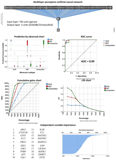 The multilayer perceptron analysis correlated the 730 pancancer immune profiling genes with the molecular subtypes of GCB, ABC, and Unspecified. The artificial neural network successfully predicted the molecular subtypes with high accuracy (Figure 12). The classification was correct in 98.7% of the cases in the training set and 81.5% of those in the testing set. The area under the curve was 0.99 for both GCB and ABC and 0.98 for the Unspecified group. Table 1 shows the details of this artificial neural network. According to their normalized importance for predicting the molecular subtype, the top most relevant genes were A2M, ABCB1, ABL1, ADA, ADORA2A, AICDA, AIRE, AKT3, ALCAM, and AMBP (Table 2).