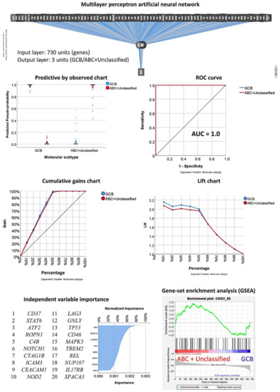 Diffuse large B-cell lymphoma (DLBCL) is one of the most frequent subtypes of non-Hodgkin lymphomas. We used artificial neural networks (multilayer perceptron and radial basis function), machine learning, and conventional bioinformatics to predict the overall survival and molecular subtypes of DLBCL. The series included 106 cases and 730 genes of a pancancer immune-oncology panel (nCounter) as predictors. The multilayer perceptron predicted the outcome with high accuracy, with an area under the curve (AUC) of 0.98, and ranked all the genes according to their importance. In a multivariate analysis, ARG1, TNFSF12, REL, and NRP1 correlated with favorable survival (hazard risks: 0.3–0.5), and IFNA8, CASP1, and CTSG, with poor survival (hazard risks = 1.0–2.1). Gene set enrichment analysis (GSEA) showed enrichment toward poor prognosis. These high-risk genes were also associated with the gene expression of M2-like tumor-associated macrophages (CD163), and MYD88 expression. The prognostic relevance of this set of 7 genes was also confirmed within the IPI and MYC translocation strata, the EBER-negative cases, the DLBCL not-otherwise specified (NOS) (High-grade B-cell lymphoma with MYC and BCL2 and/or BCL6 rearrangements excluded), and an independent series of 414 cases of DLBCL in Europe and North America (GSE10846). The perceptron analysis also predicted molecular subtypes (based on the Lymph2Cx assay) with high accuracy (AUC = 1). STAT6, TREM2, and REL were associated with the germinal center B-cell (GCB) subtype, and CD37, GNLY, CD46, and IL17B were associated with the activated B-cell (ABC)/unspecified subtype. The GSEA had a sinusoidal-like plot with association to both molecular subtypes, and immunohistochemistry analysis confirmed the correlation of MAPK3 with the GCB subtype in another series of 96 cases (notably, MAPK3 also correlated with LMO2, but not with M2-like tumor-associated macrophage markers CD163, CSF1R, TNFAIP8, CASP8, PD-L1, PTX3, and IL-10). Finally, survival and molecular subtypes were successfully modeled using other machine learning techniques including logistic regression, discriminant analysis, SVM, CHAID, C5, C&R trees, KNN algorithm, and Bayesian network. In conclusion, prognoses and molecular subtypes were predicted with high accuracy using neural networks, and relevant genes were highlighted.