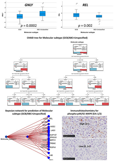 - Choi, W.W.L.; Weisenburger, D.D.; Greiner, T.C.; Piris, M.A.; Banham, A.H.; Delabie, J.; Braziel, R.M.; Geng, H.; Iqbal, J.; Lenz, G.; et al. A New Immunostain Algorithm Classifies Diffuse Large B-Cell Lymphoma into Molecular Subtypes with High Accuracy. Clin. Cancer Res. 2009, 15, 5494–5502. [Google Scholar] [CrossRef] [Green Version]