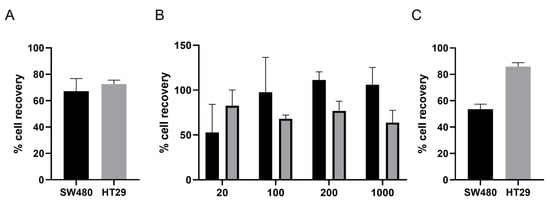Subsequently, recovery rates and the limit of detection of the ImageStream®X Flow Cytometer (Luminex, Belgium) were determined using a range of between 20 and 2000 cancer cells spiked in carrier leukocytes from healthy donors. Efficiencies varied between 50% and 100% and increased with increasing numbers of cells for SW480, whereas for HT29, efficiencies were 82.5%, 68.0%, 76.8% and 63.8% for 20, 100, 200 and 1000 cells, respectively, and did not change significantly with increasing cell numbers (Figure 1B).