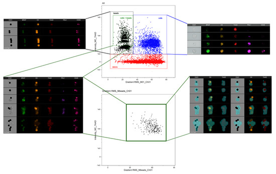Although we demonstrated that the magnetic beads used during CTC isolation are compatible with the ImageStream®X (Luminex, Belgium) platform, they emit fluorescence at any laser intensity and thus need to be removed from the analysis; otherwise, fluorescence intensities will be overestimated. We treated the samples with papain to detach most of the magnetic beads from CTCs, facilitating their analysis. The use of papain increased the percentage of cytokeratin-positive bead-free cells from 46.9% to 91.38% (p = 0.024) (Figure S1A); however, some CTCs still had beads attached to their membrane (Figure 2, top). Thus, we ran the whole sample after papain treatment (both supernatant and pellet) to reduce the risk of losing CTCs. As shown in Figure 2, cells were identified using the “Gradient RMS_M01” feature and “Intensity_MC_7ADD”. Cells without magnetic beads were had “Gradient RMS_M01” values greater than 40 and nuclear intensities greater than 1000; however, cells attached to beads had “Gradient RMS_M01” values below 30 (this might be considered a non-focussed event).