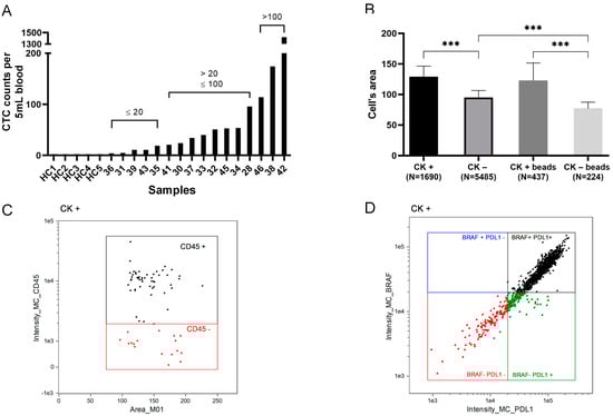 Circulating tumour cell (CTC) enumeration and characterisation based on cytokeratin (CK) expression. (A) The number of CTCs in 5 mL of peripheral blood (y-axis) per patient and healthy controls (HC) ordered by increasing cell counts (x-axis). Asterisk represents 5 healthy controls. (B) Mean size (in µm) comparison of cells depending on CK expression of either single cells (CK+/CK−) or CTCs attached to beads (CK+ beads/CK− beads). Number of cells used to calculate mean size is shown in brackets. (C) A scatter plot example of the CK+ population of a patient based on CD45 expression. (D) Characterisation of CTCs based on BRAFV600E and PD-L1 expression. *** p value is <0.001 for ANOVA test followed by Turkey’s post hoc analyses.