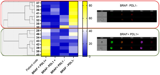We identified that BRAFV600E expression (measured as fluorescence intensity) was highly correlated with CK expression only in the BRAF+/PD-L1− population (p = 0.035), whereas PD-L1 expression was independent of either CK or BRAFV600E in all four populations. We did not find a significant correlation (p = 0.079) between BRAFV600E+/PD-L1− and BRAFV600E−/PD-L1+ populations, suggesting that the expression of both markers in CTCs was independent. However, we did find a significant (p < 0.0001) negative correlation between the double-positive (BRAFV600E+/PD-L1+) and double-negative (BRAFV600E−/PD-L1−) populations, suggesting that they might serve as classification tools. In fact, the most frequent CTC subpopulation was the double-negative (100%), followed by the double-positive (88%). More variability was found in single-positive populations, which were found in 69% and 63% of the patients (for PD-L1+ and BRAFV600E+, respectively). Hierarchical clustering between groups identified two main clusters according to double positivity (BRAFV600E+/PD-L1+) and double negativity (BRAFV600E−/PD-L1−) (Figure 4). We also recognised a CK−/CD45+ population expressing PD-L1 in 62.5% (10/16) patients, whereas we only identified BRAFV600E positivity in the CK−/CD45+ population in 18.75% (3/16).