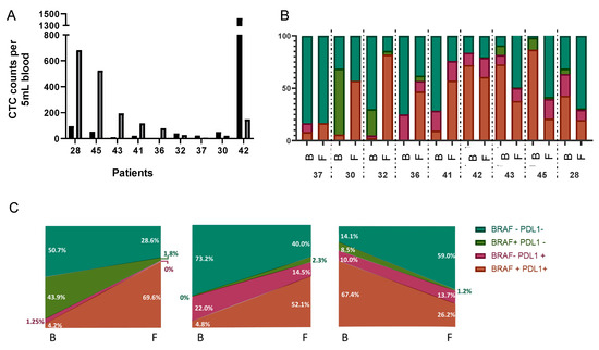 Evaluation of CTC counts and subpopulation evolution during patient follow-up. (A) Bar graph representing CTC numbers in 5 mL of peripheral blood at baseline (black) and one month after loco-regional surgery (grey) for 9 patients. (B) Evolution of the 4 CTC subpopulations based on BRAFV600E and/or PD-L1 expression. For each patient, B indicates baseline, and F indicates follow-up. (C) Model of the CTC subpopulations’ main evolution processes. Colours are: brown: BRAFV600E+/PD-L1+; pink: BRAFV600E−/PD-L1+; green: BRAFV600E+/PD-L1−; and cyan: BRAFV600E−/PD-L1−.