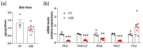 Figure 1. Decreased bile flow and alterations in the hepatobiliary transport system in C26 cachectic mice. (a) Bile flow in sham-injected mice (CT; n = 4) and colon carcinoma 26-transplanted mice (C26; n = 8). (b) Hepatic mRNA expression levels of genes involved in the hepatobiliary transport system in CT and C26 mice. Ntcp, Na(+)/taurocholate transport protein; Oatp1β2, organic anion transporter family member 1B2; Bsep, bile salt export pump; Mrp2, multidrug resistance-associated protein 2; Ostβ, organic solute transporter subunit beta. n = 4–8 mice per group; data are presented as mean ± SEM, * p < 0.05, ** p < 0.01, *** p < 0.001.