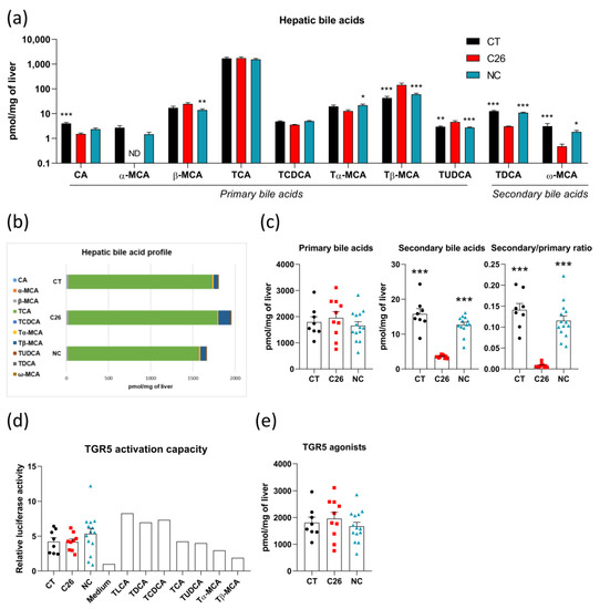 Figure 3. Alterations in bile acid profile are intrinsically related to cachexia without any modification of TGR5 activation capacity in C26 mice. (a) Hepatic bile acids in sham-injected mice (CT; n = 8), mice injected with cachexia-inducing C26 colon carcinoma cells (C26 mice; n = 10), and mice injected with non-cachexia-inducing C26 colon carcinoma cells (NC mice; n = 14). (b) Hepatic bile acid profile in CT, C26, and NC mice. (c) Primary and secondary bile acid levels and Secondary/primary ratio in the liver of CT, C26, and NC mice. (d) TGR5 activation capacity using cell reporter assay incubated with portal plasma of CT, C26, and NC mice or 10 µM of bile acids. (e) TGR5 agonists (including CA, TCA, TCDCA, TUDCA, and TDCA) levels in the liver of CT, C26, and NC mice. ND, Not detected; CA, cholic acid; α-MCA, α-muricholic acid; β-MCA, β-muricholic acid; TCA, tauro-cholic acid; TCDCA, tauro-chenodeoxycholic acid; Tα-MCA, tauro-α-muricholic acid; Tβ-MCA, tauro-β-muricholic acid; TUDCA, tauro-ursodeoxycholic acid; TDCA, tauro-deoxycholic acid; ω-MCA, ω-muricholic acid. CDCA, DCA, lithocholic acid (LCA), and TLCA were undetected. Data are presented as mean ± SEM, * p < 0.05, ** p < 0.01, *** p < 0.001 vs. C26.