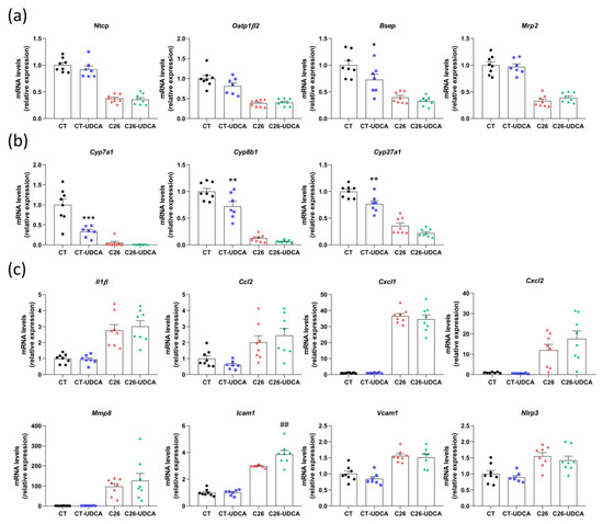 Figure 5. UDCA treatment does not improve hepatic inflammation in C26 cachectic mice. Hepatic mRNA expression levels of genes involved in the hepatobiliary transport system (a), bile acid synthesis (b) and inflammation (c) in sham-injected mice (CT), sham-injected mice treated with UDCA (CT-UDCA), mice injected with cachexia-inducing C26 colon carcinoma cells (C26), and mice injected with cachexia-inducing C26 colon carcinoma cells and treated with UDCA (C26-UDCA). Ntcp, Na(+)/taurocholate transport protein; Oatp1β2, organic anion transporter family member 1B2; Bsep, bile salt export pump; Mrp2, multidrug resistance-associated protein 2; Cyp7a1, cytochrome P450 family 7 sub-family A member 1; Cyp8b1, cytochrome P450 family 8 sub-family B member 1; Cyp27a1, cytochrome P450 family 27 sub-family A member 1; Il1β, interleukin-1β; Ccl2, C-C motif chemokine ligand 2; Cxcl1, C-X-C motif chemokine ligand 1; Cxcl2, C-X-C motif chemokine ligand 2; Mmp8, matrix metallopeptidase 8; Icam1, intercellular adhesion molecule 1; Vcam1, vascular cell adhesion molecule 1; Nlrp3, NLR family pyrin domain containing 3. n = 7–8 mice per group; data are presented as mean ± SEM. * p < 0.05, ** p < 0.01, *** p < 0.001 CT vs. CT-UDCA and ## p < 0.01 C26 vs. C26-UDCA.