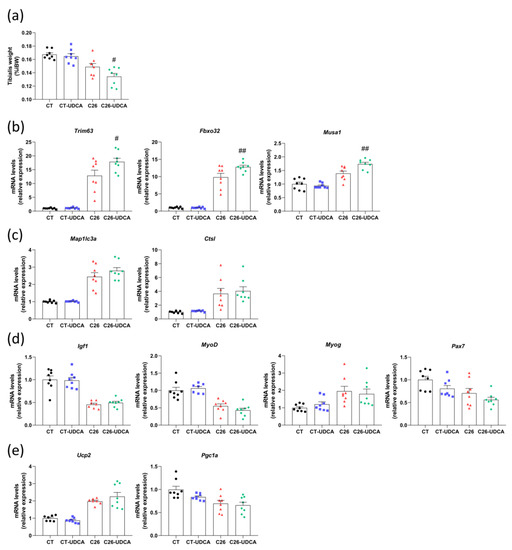 Figure 6. UDCA treatment worsens muscle atrophy in C26 cachectic mice. (a) Tibialis weight in sham-injected mice (CT), sham-injected mice treated with UDCA (CT-UDCA), mice injected with cachexia-inducing C26 colon carcinoma cells (C26), and mice injected with cachexia-inducing C26 colon carcinoma cells and treated with UDCA (C26-UDCA). Tibialis mRNA expression levels of genes involved in the ubiquitin-proteasome pathway (b), autophagy-lysosome pathway (c), differentiation (d), and mitochondrial function (e). Trim63, tripartite motif-containing 63 (also known as Murf1); Fbxo32, F-box protein 32 (also known as Atrogin1); Musa1, muscle ubiquitin ligase of the SCF complex in atrophy 1; Map1lc3a, microtubule-associated protein 1 light chain 3 alpha; Ctsl, cathepsin L; Igf1, insulin-like growth factor 1; Myog, myogenin; MyoD, myogenic differentiation 1; Pax7, paired box 7; Ucp2, uncoupling protein 2; Ppargc1a, PPARG coactivator 1 alpha. n = 7–8 mice per group; data are presented as mean ± SEM. # p < 0.05 ## p < 0.01 C26 vs. C26-UDCA.