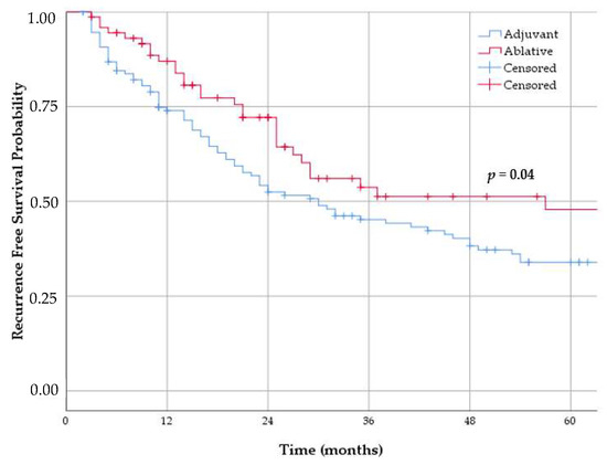 Recurrence free survival (RFS) and durable response combined after RF-CHT for ablative dose group and adjuvant dose group. Patients treated with ablative dose had significant better RFS and durable response (univariable analysis p = 0.04).