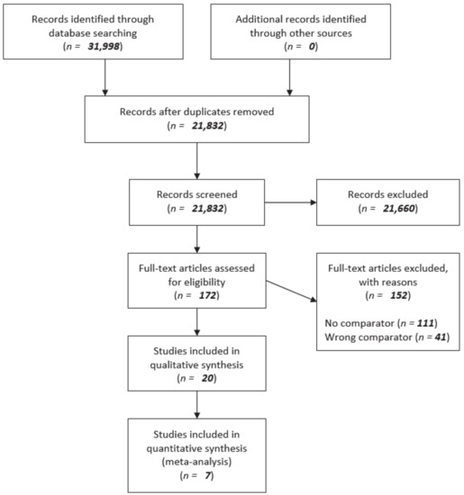 The literature search identified 31,998 articles. After removal of duplicates a total of 21,832 articles were screened. Based on title and abstract 172 articles were selected for full-text review. The following reasons for exclusion were found: no comparator (n = 111) or wrong comparator (n = 41). Twenty articles met the inclusion criteria for qualitative synthesis by tabulation. In addition, seven articles used univariate analysis or sufficiently corrected for potential confounders using matching and/or multivariate analysis to allow inclusion in the meta-analysis (quantitative synthesis). Results regarding the comparison of NAC plus repeat local treatment versus upfront repeat local treatment alone were mentioned as incidental result in the majority of the included articles. The search results are presented in Figure 1: A flow diagram of the systematic search and selection according to PRISMA [44].