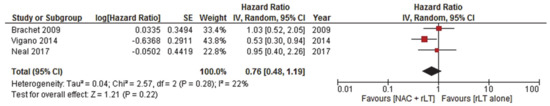 Seven studies [46,48,59,60,61,63,64] were compatible for meta-analysis, presented in Figure 2, Figure 3, Figure 4 and Figure 5, respectively reporting OS and the 1-, 3-, and 5-year OS (Table 3). Viganò et al. reported HR = 0.529 (0.299–0.934; p-value = 0.028) for OS. Generic inverse variance with random effects analysis model showed HR = 0.76 (0.48–1.19; p-value = 0.22) for OS. Mantel–Haenszel method with random effect analysis model showed a one-year OS RR of 0.87 (0.33–2.29; p-value = 0.78), a three-year OS RR of 1.41 (0.73–2.73; p-value = 0.31), and a five-year OS RR of 0.91 (0.78–1.07; p-value = 0.25). Two series did not report a difference in OS [45,57], five suggested a trend towards improved survival in selected patient groups treated with NAC [51,54,55,56,58] without defining eligibility criteria for receiving NAC (Table 3 and Table 4).
