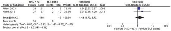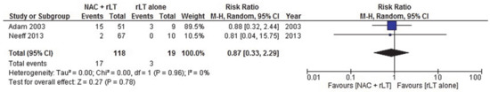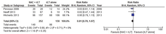 The level of evidence to reliably assess the additive value of NAC was very low [65]. Direct comparisons of NAC plus repeat local treatment versus repeat local treatment alone were merely mentioned as subgroup analyses in all included series. In 13/20 articles, the specific statistical method used to compare the groups was either unsatisfactory or could not be deduced.