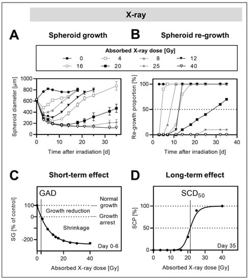 For evaluating the long-term effects of radiation treatments, the percentage of non-re-grown and therefore controlled spheroids per treatment group was monitored during a follow-up of up to 35 days after treatment start and reported as spheroid control probability (%SCP), as described elsewhere [52]. For each spheroid, an increase in diameter of less than 20 µm per day or a final diameter below 600 µm was defined as spheroid control. The 35-day %SCP values at increasing treatment doses were fitted with dose–response Equation (5) and the half-maximal spheroid control dose (SCD50) was calculated.