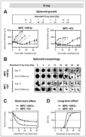 Effect of Hif2α expression on the response of MPC spheroids to single-dose external X-ray irradiation; diameters at treatment start: 499 ± 3 (MPC +HIF2α), 479 ± 3 (MPC + EV); (A) changes in spheroid diameters in response to increasing single-doses of irradiation; (B) arrays of spheroid micrographs recorded at day 11 compared to the final day of follow-up (each image shows a section of 1.57 × 1.57 mm2); (C) short-term effects of irradiation at increasing doses presented as relative spheroid growth (%SG, 0–6 days after irradiation); (D) long-term effects of irradiation at increasing doses presented as spheroid control probabilities (%SCP, 35 days after irradiation).