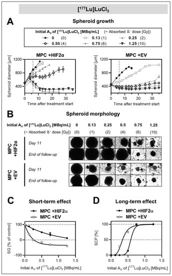 Effect of Hif2α expression on the response of MPC cell spheroids to [177Lu]LuCl3; diameters at treatment start: 492 ± 6 (MPC +HIF2α), 448 ± 3 (MPC + EV); (A) changes in spheroid diameters in response to increasing initial activity concentrations of [177Lu]LuCl3 (vertical dashed lines: end of treatment); (B) arrays of spheroid micrographs recorded at day 11 compared to the final day of follow-up (each image shows a section of 1.29 × 0.96 mm2); (C) short-term effects of [177Lu]LuCl3 with increasing initial activity concentrations presented as relative spheroid growth (%SG, 0–6 days after incubation start); (D) long-term effects of [177Lu]LuCl3 with increasing initial activity concentrations presented as spheroid control probabilities (%SCP, 35 days after treatment start).