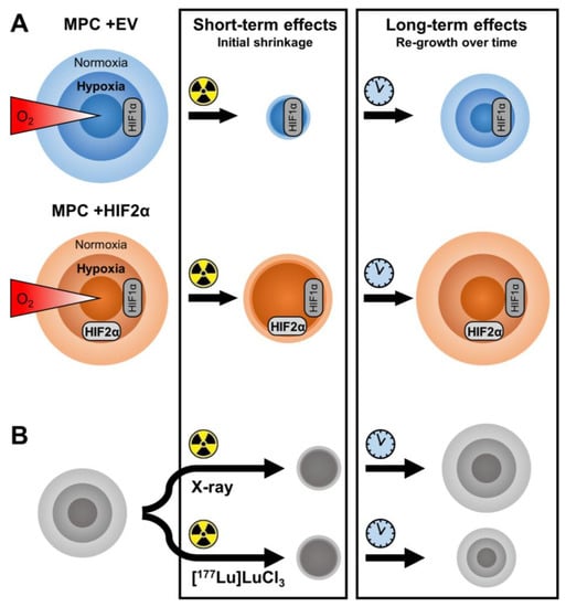 Response of MPC spheroids to radiation treatments. (A) Expression of Hif2α increases the radioresistance of MPC spheroids affecting both initial shrinkage and re-growth over time; (B) prolonged [177Lu]LuCl3 treatment more effectively delays the re-growth of MPC spheroids compared to single-dose external X-ray irradiation.
