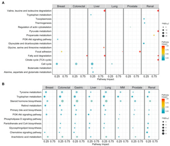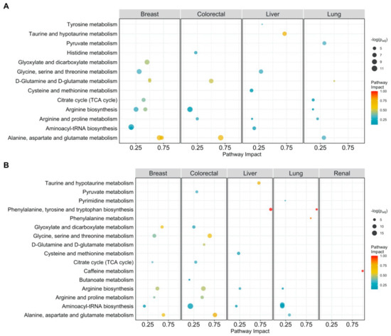 Pathway analysis plot showing the impact on metabolic pathways that are significantly enriched (padj < 0.05) and have a pathway impact score > 0.1 per cancer type. Datapoints are colored according to their impact score. (A) Pathway impact according to differentially abundant metabolites (padj < 0.05); (B) pathway impact according to differentially connected metabolites (Benjamini-Hochberg adjusted p-value padj < 005).