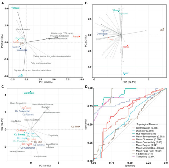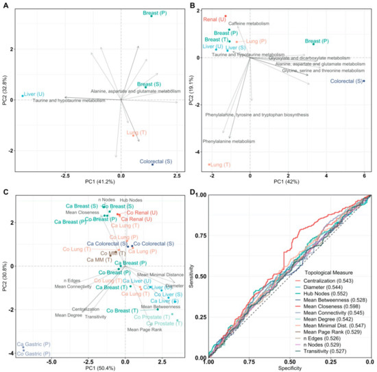 Principal Component Analysis (PCA) of pathway impact and network analysis. PCA labels are colored according to their cancer type and PCA loadings are labeled if they have a pathway impact score > 0.5. Sample origin is labeled as T, U, S, P for tissue, urine, serum, and plasma, respectively. Multiple myeloma is abbreviated as MM. (A) PCA biplot of pathway impact based on differentially abundant metabolites per cancer type; (B) PCA biplot of pathway impact based on differentially connected metabolites per cancer type; (C) PCA biplot of topological network measures per cancer type for all inferred metabolite association networks. Here, networks inferred from cancer or control samples are labeled as “Ca” and “Co”, respectively; (D) receiver operating characteristic curves of topological measures predicting cancer pathology on metabolite association networks (n = 28, 14/14). Predictions are based on logistic regression, cross-validated with leave-one-out cross-validation. The Area Under the Curve (AUC), 95% confidence interval (CI), and p-value of all topological measures are Nodes: AUC = 0.529, 95% CI = 0.488–0.570, p = 0.170, Edges: AUC = 0.526, 95% CI = 0.485–0.567, p = 0.216, Mean Connectivity: AUC = 0.545, 95% CI = 0.504–0.586, p = 0.0302, Mean Degree: AUC = 0.542, 95% CI = 0.501–0.583, p = 0.0470, Mean Closeness: AUC = 0.598, 95% CI = 0.557–0.638, p = 2.20 × 10−6, Mean Betweenness: AUC = 0.528, 95% CI = 0.487–0.570, p = 0.175, Diameter: AUC = 0.544, 95% CI = 0.503–0.585, p = 0.0369, Mean Minimal Distance: AUC = 0.547, 95% CI = 0.506–0.588, p = 0.0244, Mean Page Rank: AUC = 0.529, 95% CI = 0.488–0.570, p = 0.165, Hub Nodes: AUC = 0.552, 95% CI = 0.511–0.593, p = 0.0137, Centralization: AUC = 0.543, 95% CI = 0.502–0.584, p = 0.0422, and Transitivity: AUC = 0.527, 95% CI = 0.486–0.568, p = 0.196. Definitions of topological measures are given in Methods.