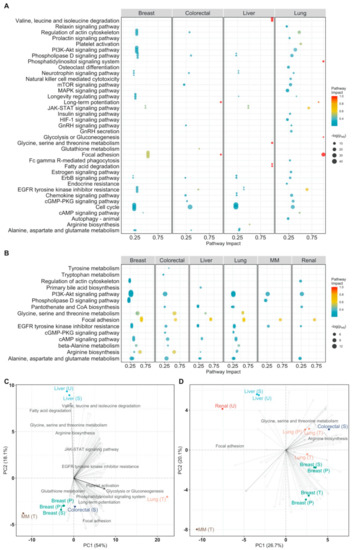 Joint pathway analysis. Multiple myeloma is abbreviated as MM. Sample origin of the metabolomics counterpart is labeled as T, U, S, P for tissue, urine, serum, and plasma, respectively. (A) Pathway analysis score plot of the impact on cellular pathways that are significantly enriched (padj < 0.05) per cancer type according to differentially expressed genes (padj < 0.05) and differentially abundant metabolites (padj < 0.05); (B) pathway analysis score plot of the impact on cellular pathways that are significantly enriched (padj < 0.05) per cancer type according to differentially connected genes (padj < 0.05) and differentially connected metabolites (padj < 0.05). Data points are colored according to their impact score; (C) PCA biplot of pathway impact based on differentially expressed genes and differentially abundant metabolites per cancer type; (D) PCA biplot of pathway impact based on differentially connected genes and differentially connected metabolites per cancer type. Datapoints are colored according to their cancer type. PCA loadings are labeled only if corresponding to a pathway impact score >0.5. padj indicates Benjamini–Hochberg corrected p-values.
