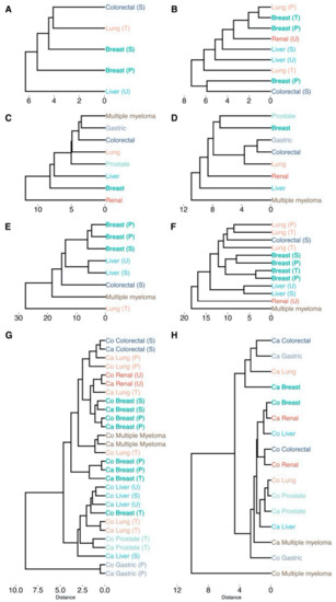 The re-analysis of metabolomic and transcriptomic cancer data indicate that different cancer types are characterized by different metabolomic and transcriptomic landscapes and that different biological characteristics are highlighted when considering molecular signatures that are obtained using differentially abundant/connected metabolites and genes. The relationships between the different cancer types as expressed by differences and commonalities in the impacted and deregulated metabolic pathways are shown in the clustering trees in Figure 6A–F.