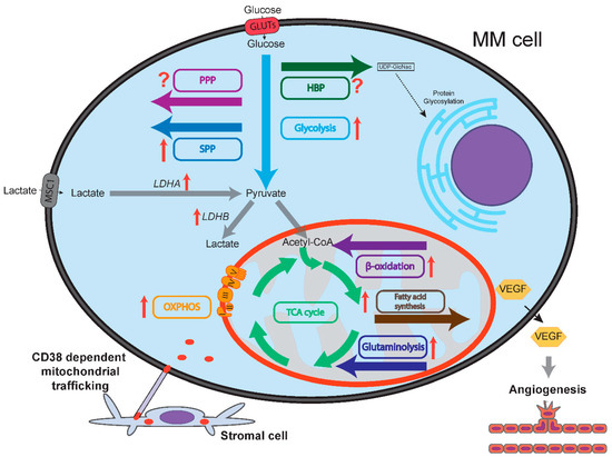 Schematic representation of multiple myeloma (MM) cell metabolism compared to normal plasma cells. Flow of metabolites is shown by colored arrows. Glycolysis, OXPHOS, serine synthesis pathway (SSP), glutaminolysis, fatty acid synthesis and fatty acid oxidation (β-oxidation) are all upregulated in MM cells compared to normal plasma cells, as indicated by red arrows. Lactate dehydrogenase A (LDHA) and B (LDHB) are upregulated in MM cells. It is unclear whether the pentose phosphate pathway (PPP) and the hexosamine biosynthesis pathway (HBP) are up/downregulated in MM cells compared to normal plasma cells, as designated by question marks. MM cells express vascular endothelial growth factor (VEGF) that increases bone marrow oxygenation by inducing angiogenesis. Increased bone marrow oxygenation may stimulate oxidative phosphorylation (OXPHOS) in MM cells. CD38-dependent nanotubes transport mitochondria from stromal cells to MM cells, mitochondrial fusion further sustains OXPHOS.