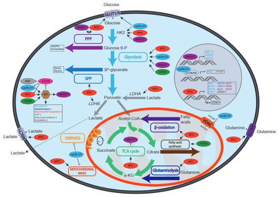 Glycolysis, glutaminolysis and fatty acid oxidation primarily drive the TCA cycle for anaplerosis and to generate ATP, which takes place in the mitochondria, and are critically controlled by MYC in cancer cells. Mitochondrial mass is subject to homeostatic control, and during cell growth mitochondrial biogenesis is increased. In resting cells, mitochondrial biogenesis is coordinated by peroxisome proliferator-activated receptor gamma coactivator 1-alpha (PGC1α), whereas this is controlled by MYC in proliferating cells [145,146,147]. Furthermore, mitochondrial activity is associated with altered rates of mitochondrial fusion and fission, which were also found to be regulated by MYC. It was shown that re-expression of Myc in Myc−/− fibroblasts resulted in the increase in mitochondrial mass by favoring mitochondrial fusion over fission [148]. In MM cells, the expression of several genes involved in mitochondrial biogenesis were found to be upregulated compared to normal plasma cells [149]. Of interest, a recent report described an alternate mechanism by which MM cells may fulfil metabolic demands; in co-culture studies it was shown that mitochondria are transferred from bone marrow stromal cells to MM cells, which involved the formation of CD38-dependent nanotubes [150]. It was suggested that the transferred mitochondria might stimulate the function of the MM cell mitochondria, perhaps through mitochondrial fusion regulated by MYC [151]. In addition, the mitochondrial fission factor (MFF) was identified as a transcriptional target of MYC, and was found to be overexpressed in cancer cells. MFF was shown to associate with the voltage-dependent anion channel-1 (VDAC1) and to be of crucial importance for mitochondrial fitness. MMF silencing resulted in the loss of mitochondrial membrane potential and apoptosis [152].